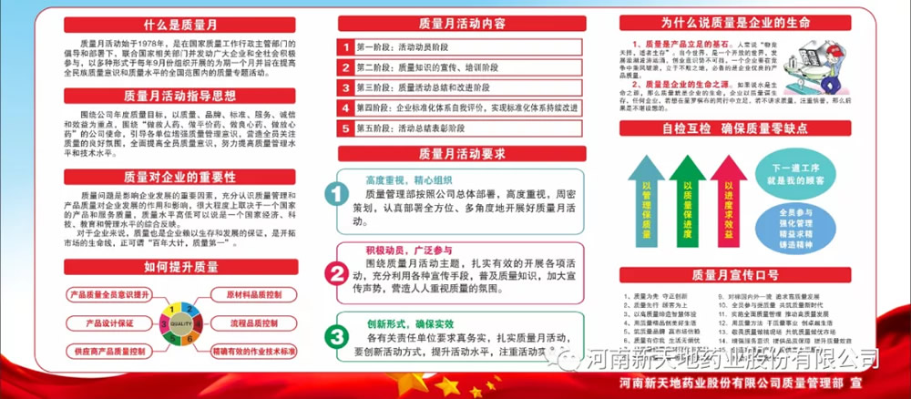 每年9月为全国“质量月”,“质量月”是在政府有关部门的倡导和部署下,由全社会尤其是广大企业积极参与的年度专题活动,旨在提高全民质量意识与质量管理水平。根据国家质量月活动安排,结合hth华体育app官网登录(中国)官方网站发展战略,提升员工质量意识,增强企业凝聚力和市场竞争力,2021年“质量月”hth华体育app官网登录(中国)官方网站活动主题为“践行质量标准化,再谱医药新时代”。围绕“做救人药、做平价药、做良心药、做放心药”使命,以质量、品牌、标准、服务、诚信和效益为重点,实现hth华体育app官网登录(中国)官方网站年度质量目标。本次质量月活动旨在营造全员关注质量氛围、提高质量意识,从而提升企业质量管理水平和制造技术水平。